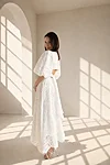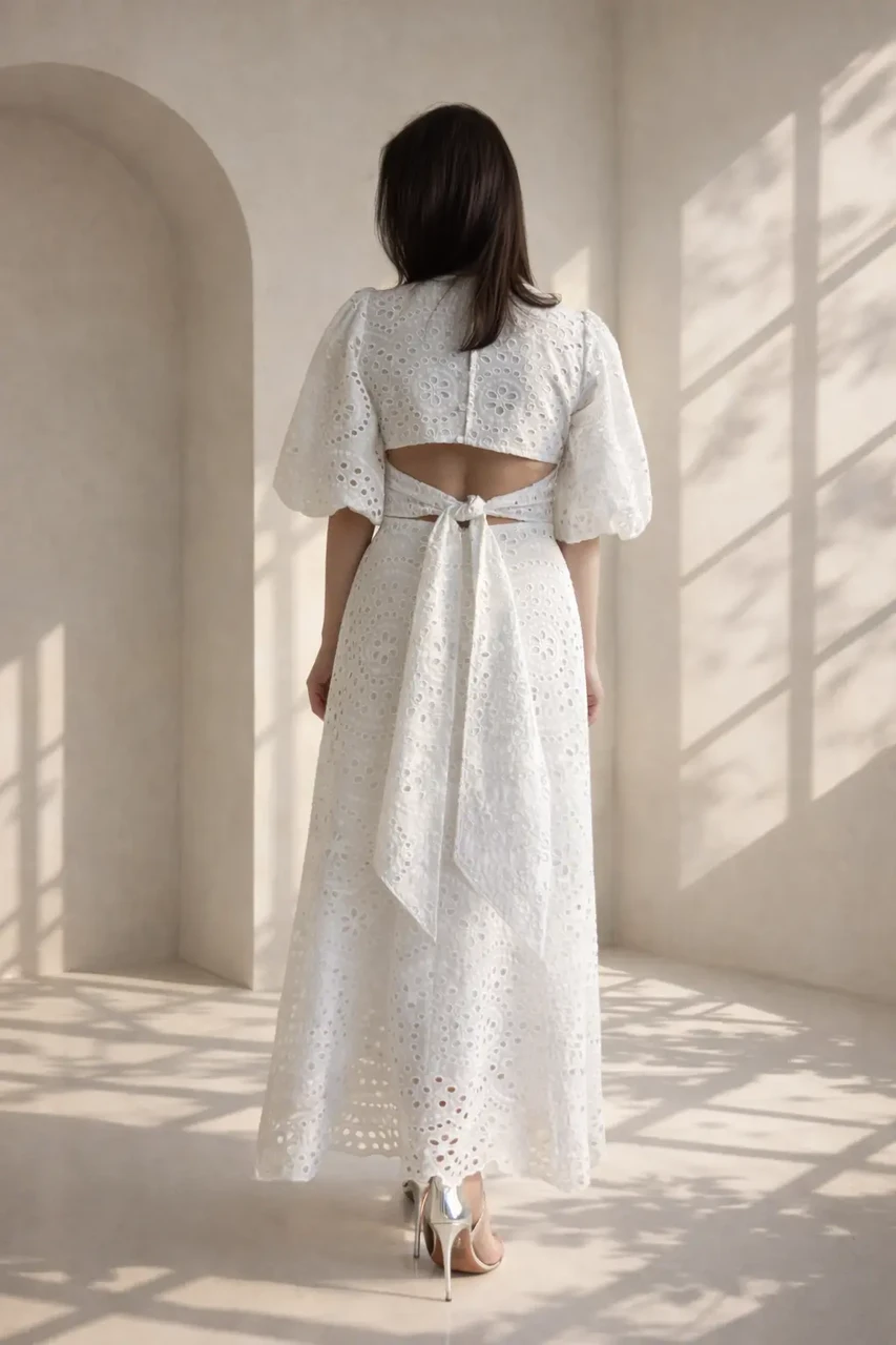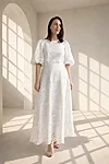 Elegantne ja ajatu puuvillane broderii kleit, mis ühendab naiseliku silueti, naturaalse materjali ja läbimõeldud detailid. Kleit on valmistatud kvaliteetsest tikitud broderii puuvillakangast, mille õhuline struktuur ja dekoratiivne muster loovad romantilise ning samas modernse ilme.