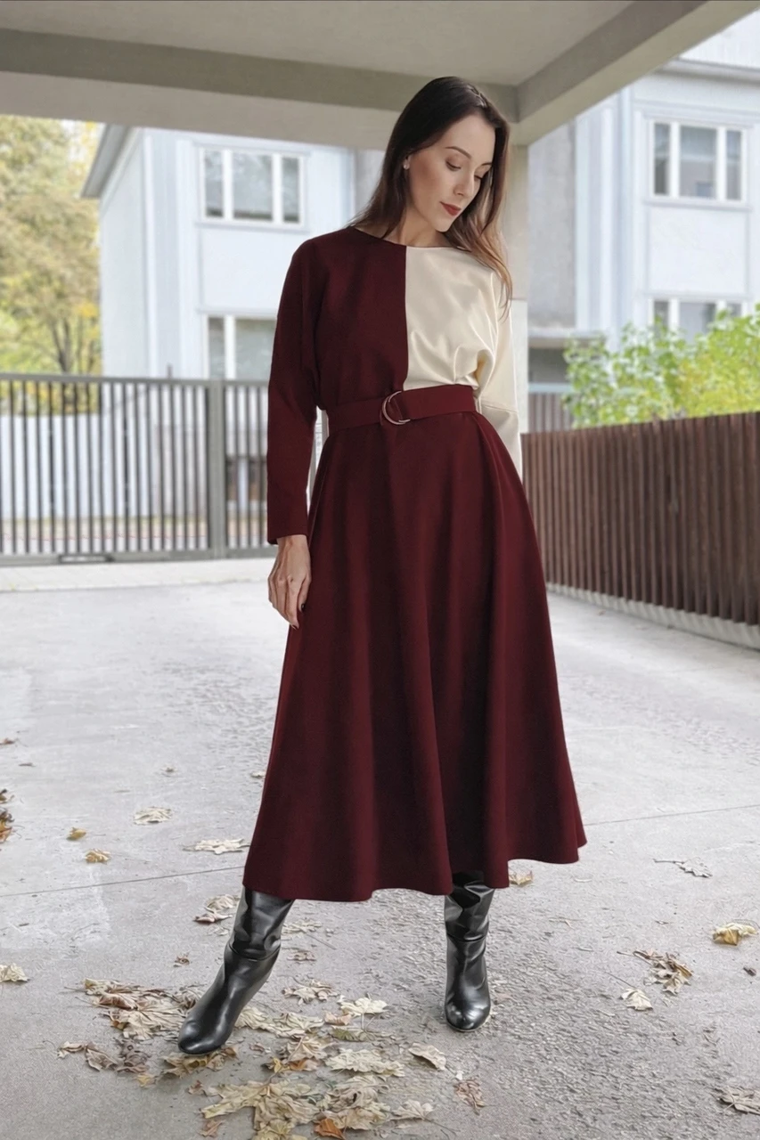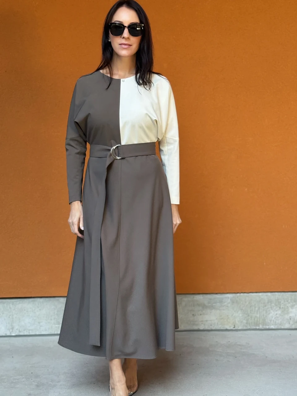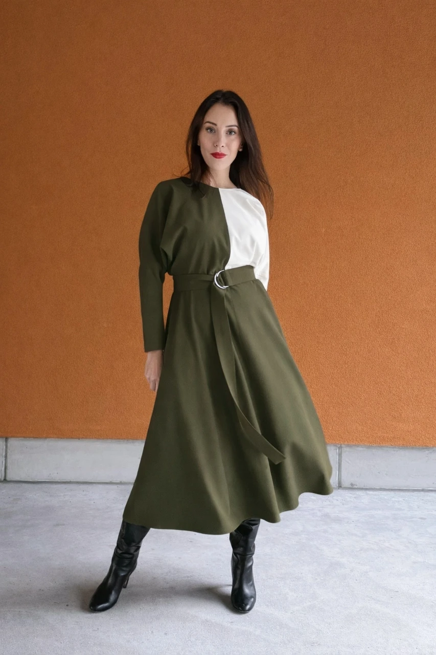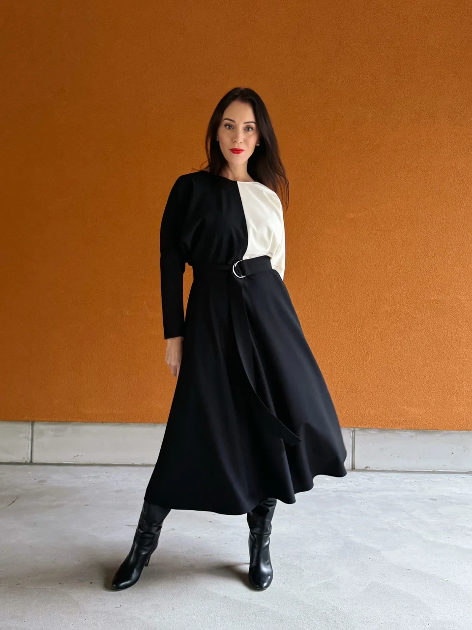 Modernne ja ajatu color block kleit, mis ühendab kaks harmoonilist toon. Minimalistlik lõige, pikad varrukad ja reguleeritav D-rõngaga vöö rõhutavad naiselikkust, samas kui kontrastne kahetooniline disain lisab arhitektuurset elegantsi.