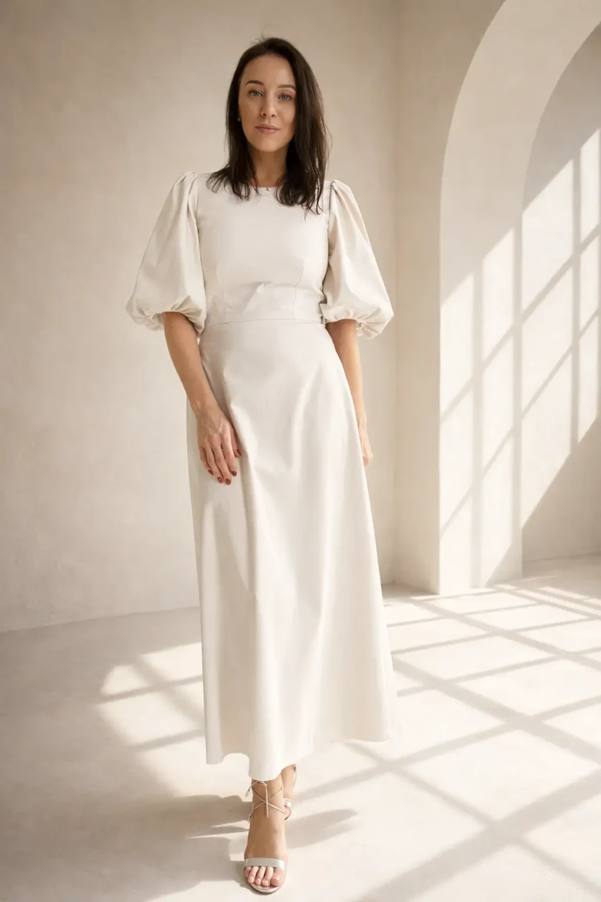 Kleit on valmistatud kaunilt langevast kangast, mis hoiab vormi ja liigub kergelt iga sammuga. Volüümikad varrukad lisavad karakterit, samas kui taljesse lõige rõhutab figuuri. Seljaosa on eriline pilgupüüdja – elegantne avatud detail ja siduv lips loovad naiseliku ja meeldejääva terviku.