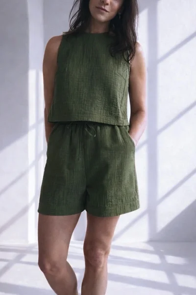 Pehme tekstuuriga musliinkangas on hingav ja nahasõbralik, mistõttu sobib komplekt ideaalselt nii soojemateks päevadeks kui ka kihiliseks kandmiseks. Minimalistlik lõige ja neutraalne toon muudavad selle lihtsasti kombineeritavaks teiste garderoobi lemmikutega.