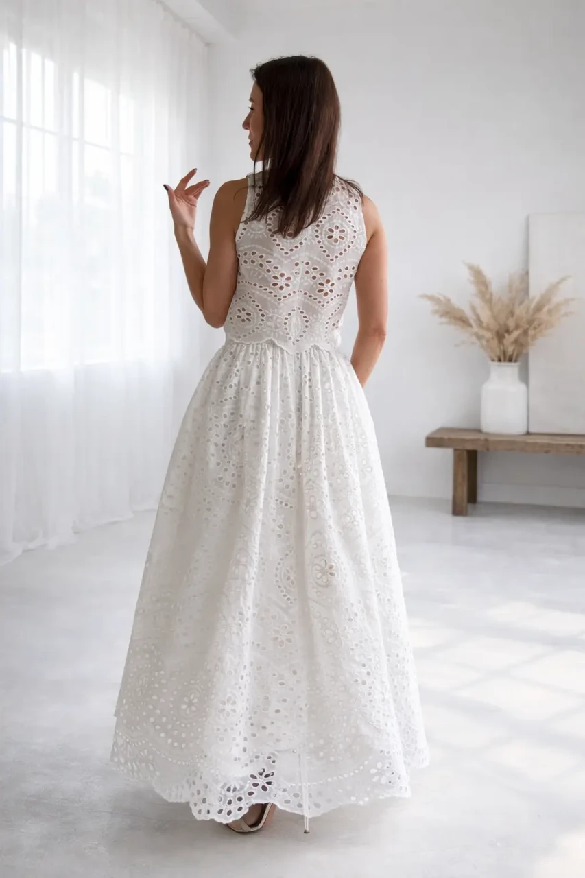 Delikaatne broderii tikand lisab tekstuuri ja luksuslikku sügavust. Läbimõeldud lõige tagab mugavuse ning kauni langevuse igal sammul.