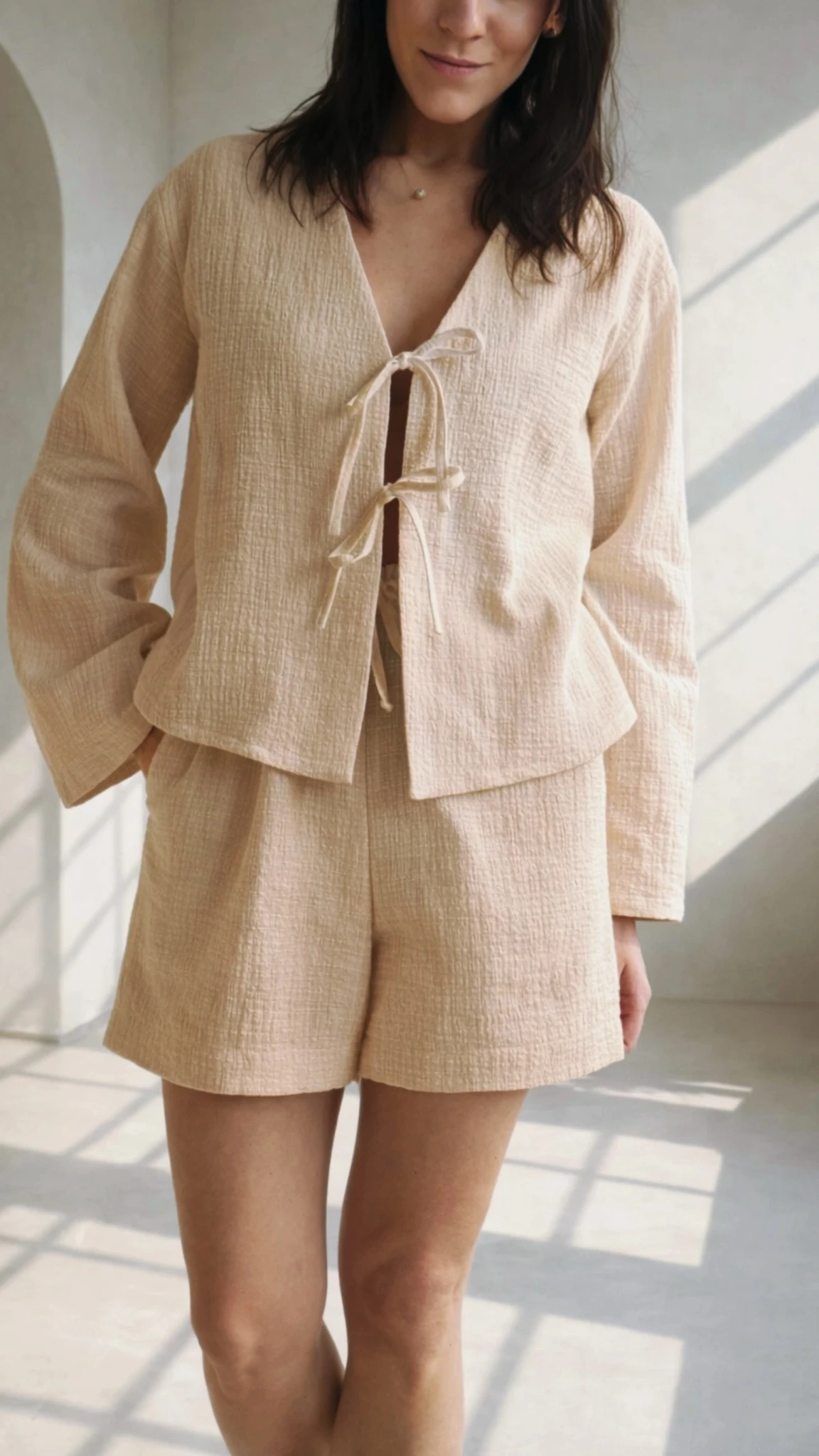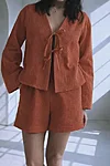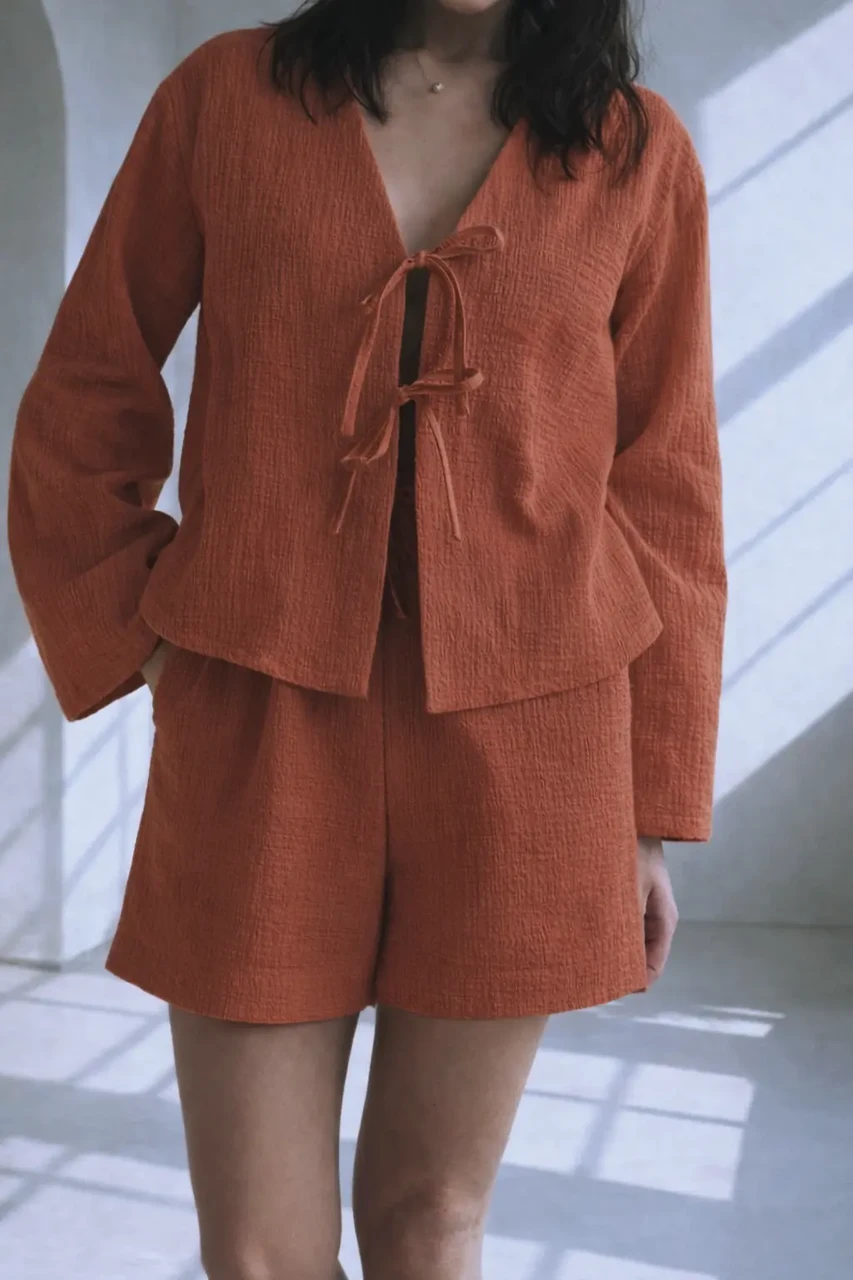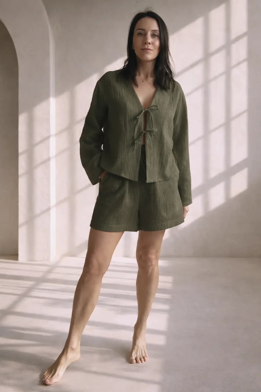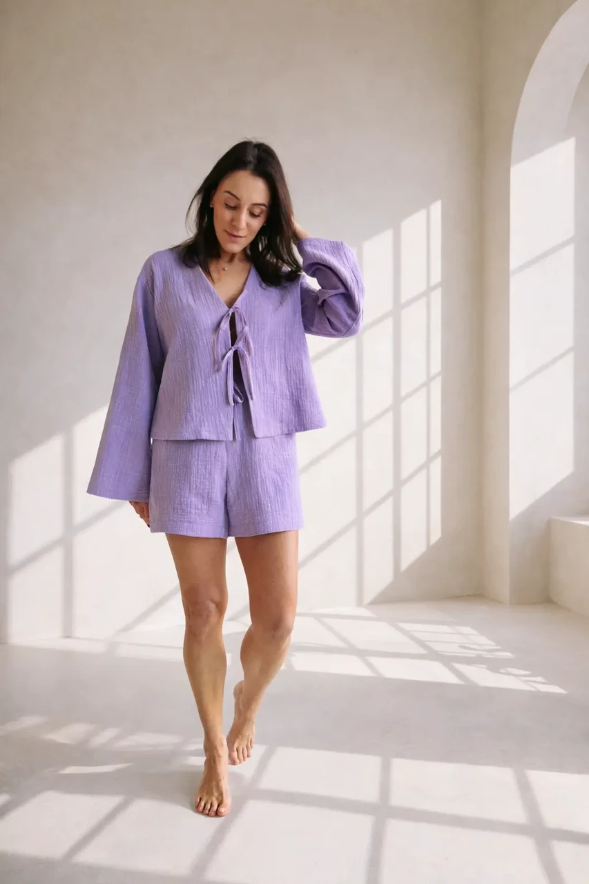 Õrn ja hingav musliinkomplekt on loodud neile, kes hindavad loomulikku ilu ja mugavust. Komplekt koosneb kergest seotava esiosaga pluusist ja mugavatest lühikestest pükstest, mis loovad pingevaba, kuid naiseliku silueti.