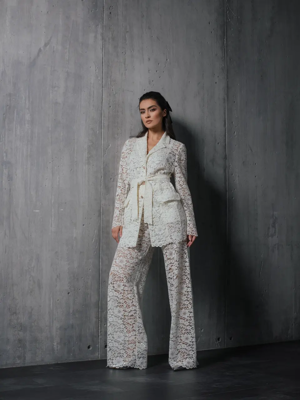 See komplekt ühendab endas klassikalise ilu ja tänapäevase stiili, luues pilkupüüdva ja rafineeritud välimuse. Kvaliteetne pitskangas annab riietusele luksusliku ja naiseliku välimuse, samal ajal kui voogavad püksid ja vööga taljesse tõmmatav jakk rõhutavad figuuri ja lisavad peenust.