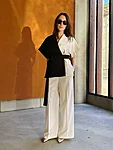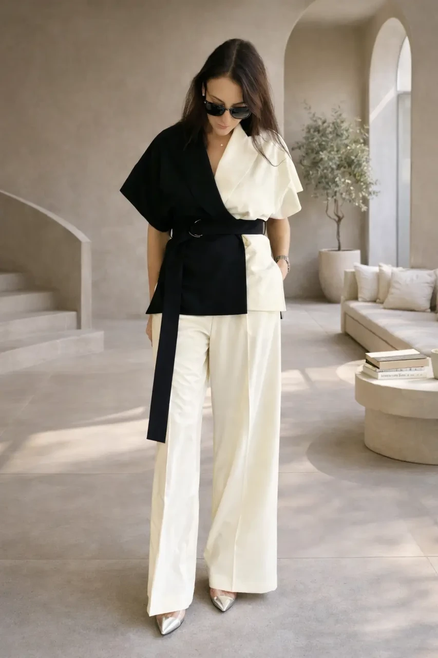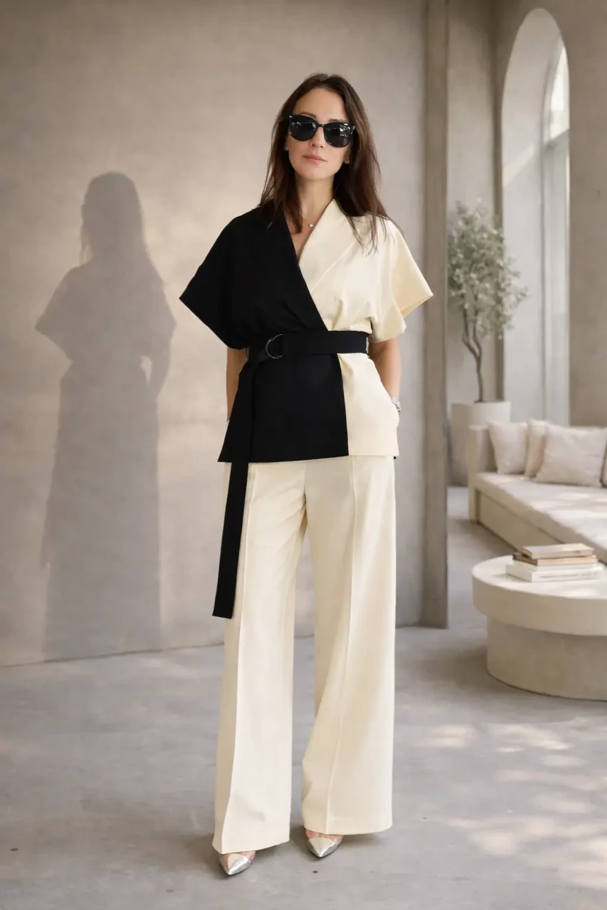 - Jakk: laia kraega, vabalt langev siluett, mida saab reguleerida vööga. Lühikesed, kergelt avatud varrukad annavad kaasaegse ja kerge ilme.