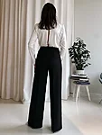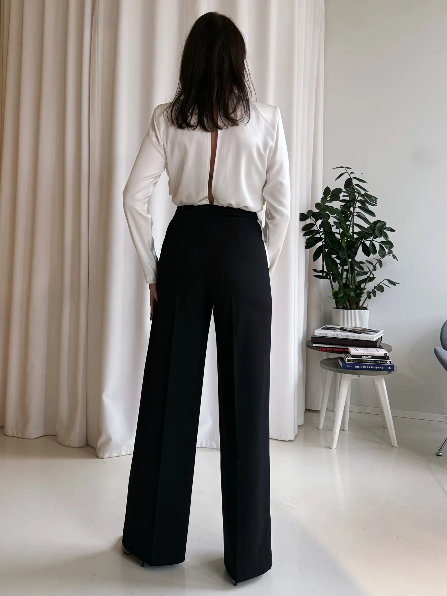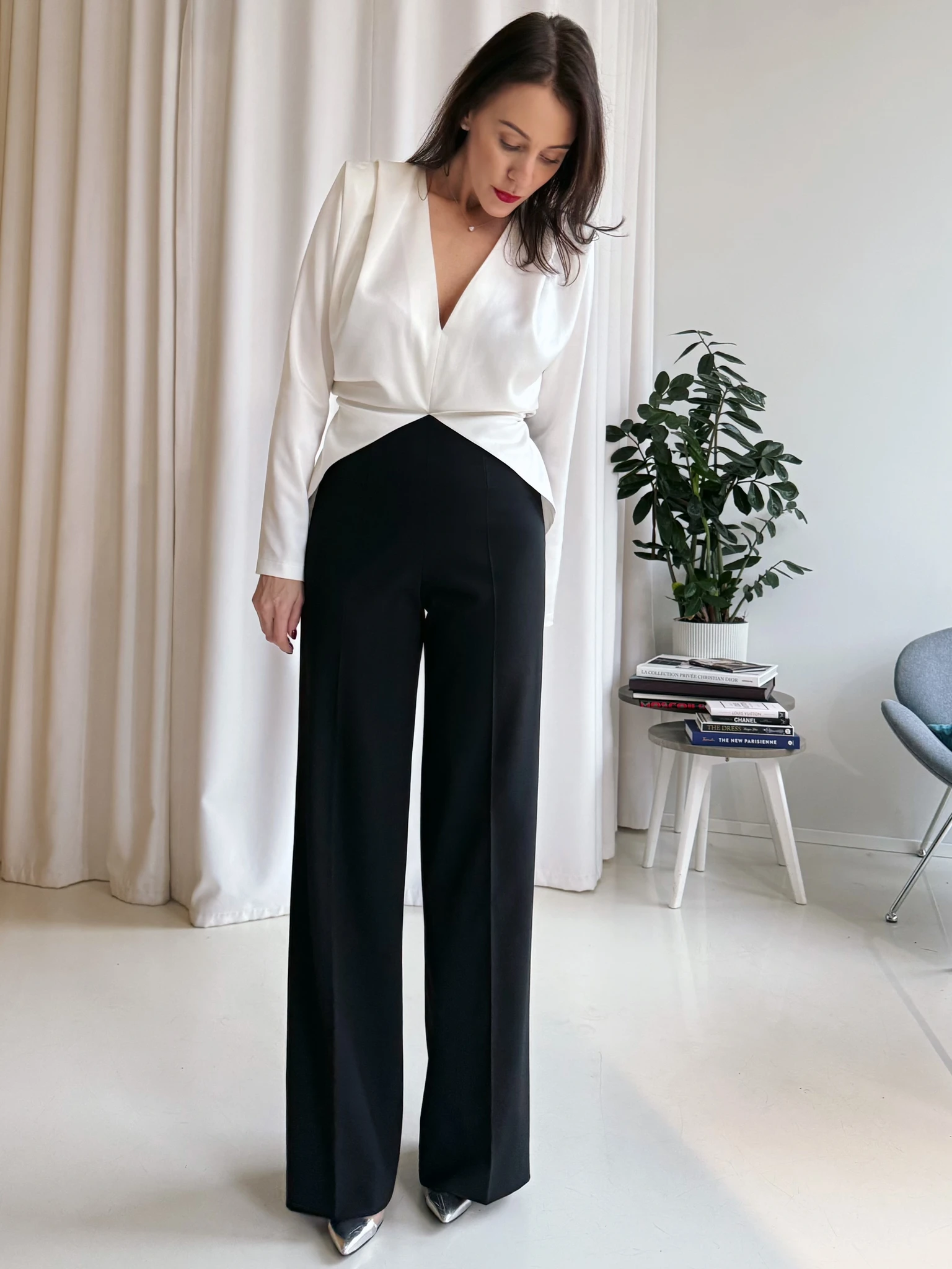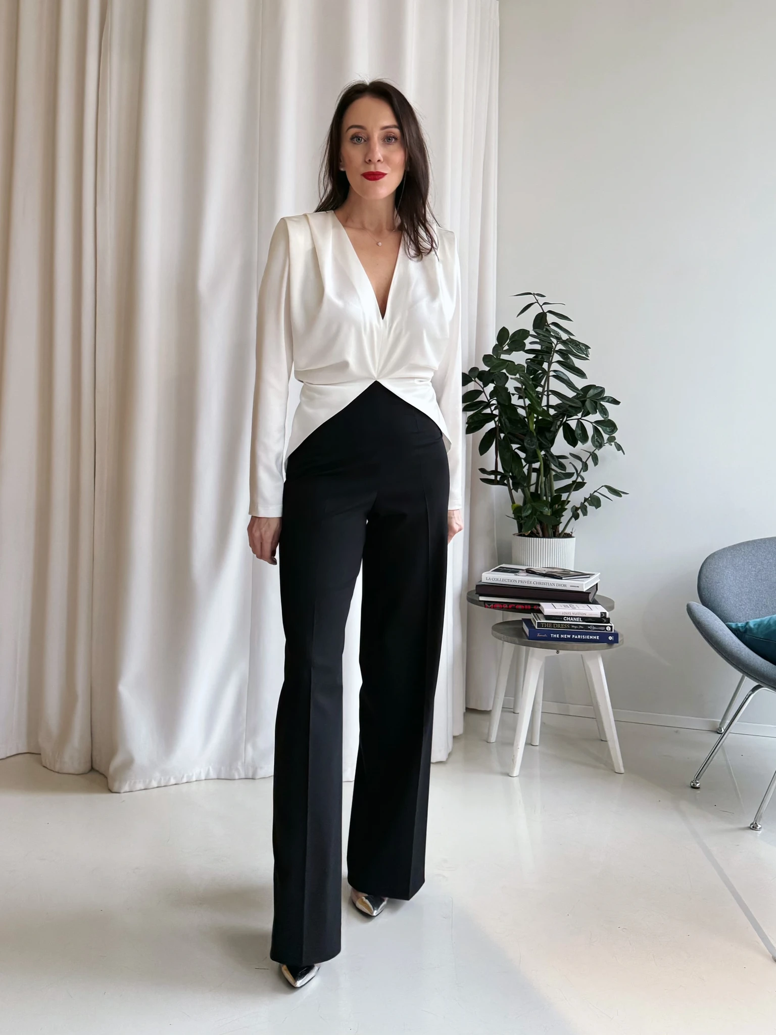Must-valge jumpsuit, mis ühendab kaasaegse minimalismi ja ajatult naiseliku silueti. Ülaosa on valmistatud kergelt läikivast valgest satiinkangast, mille elegantne detail rõhutab vööjoont ja loob puhta V-kaeluse. Mustad, kõrge vöökohaga ja laia säärega püksid pikendavad visuaalselt figuuri ning lisavad kogu look’ile arhitektuurset selgust.