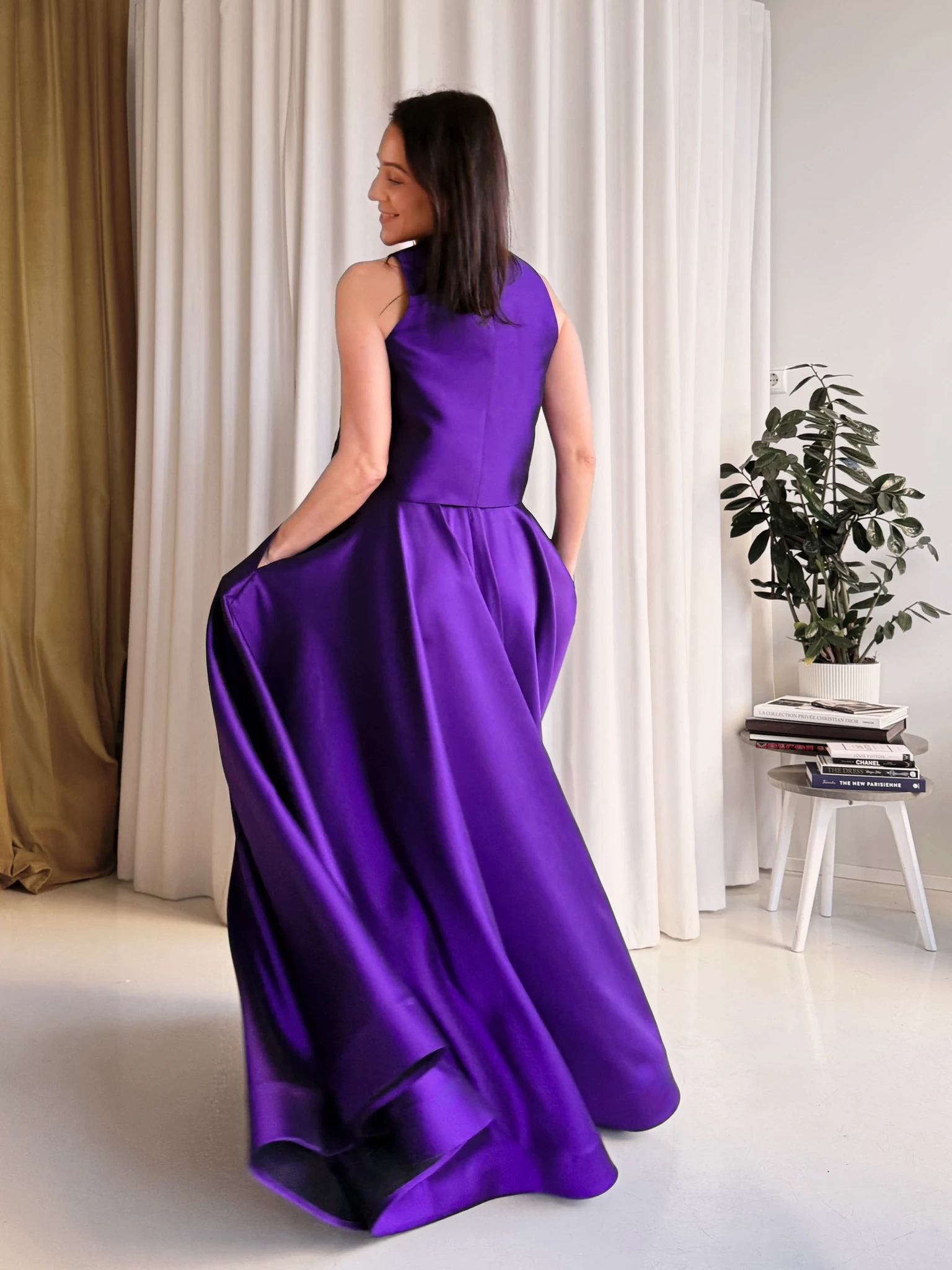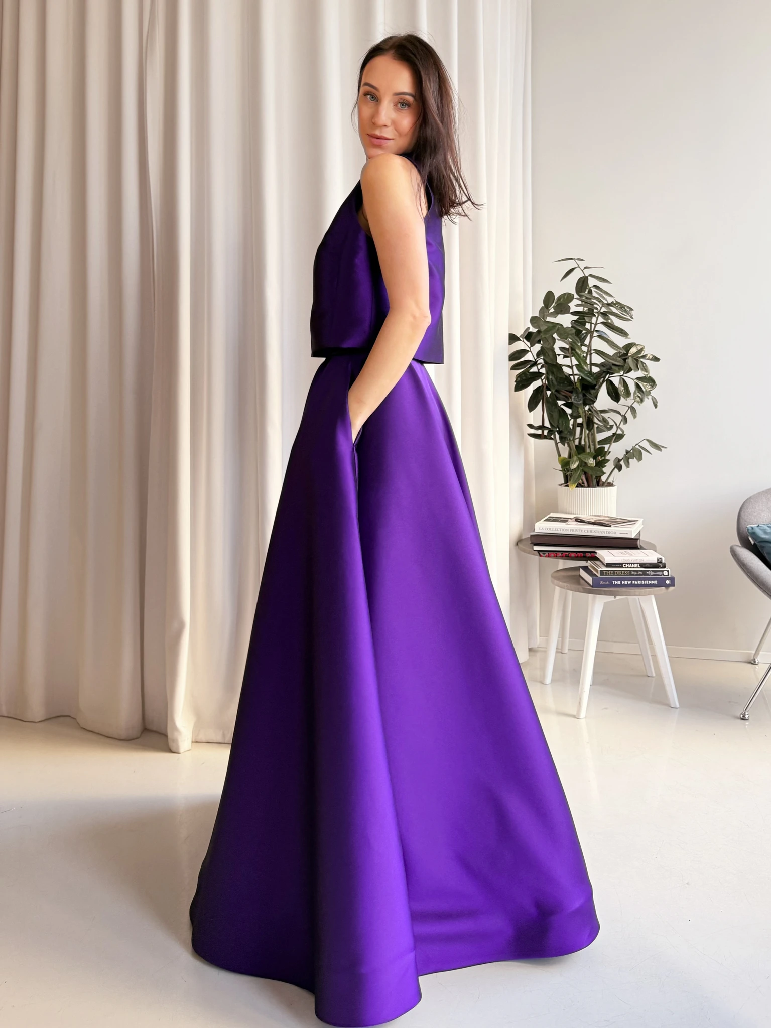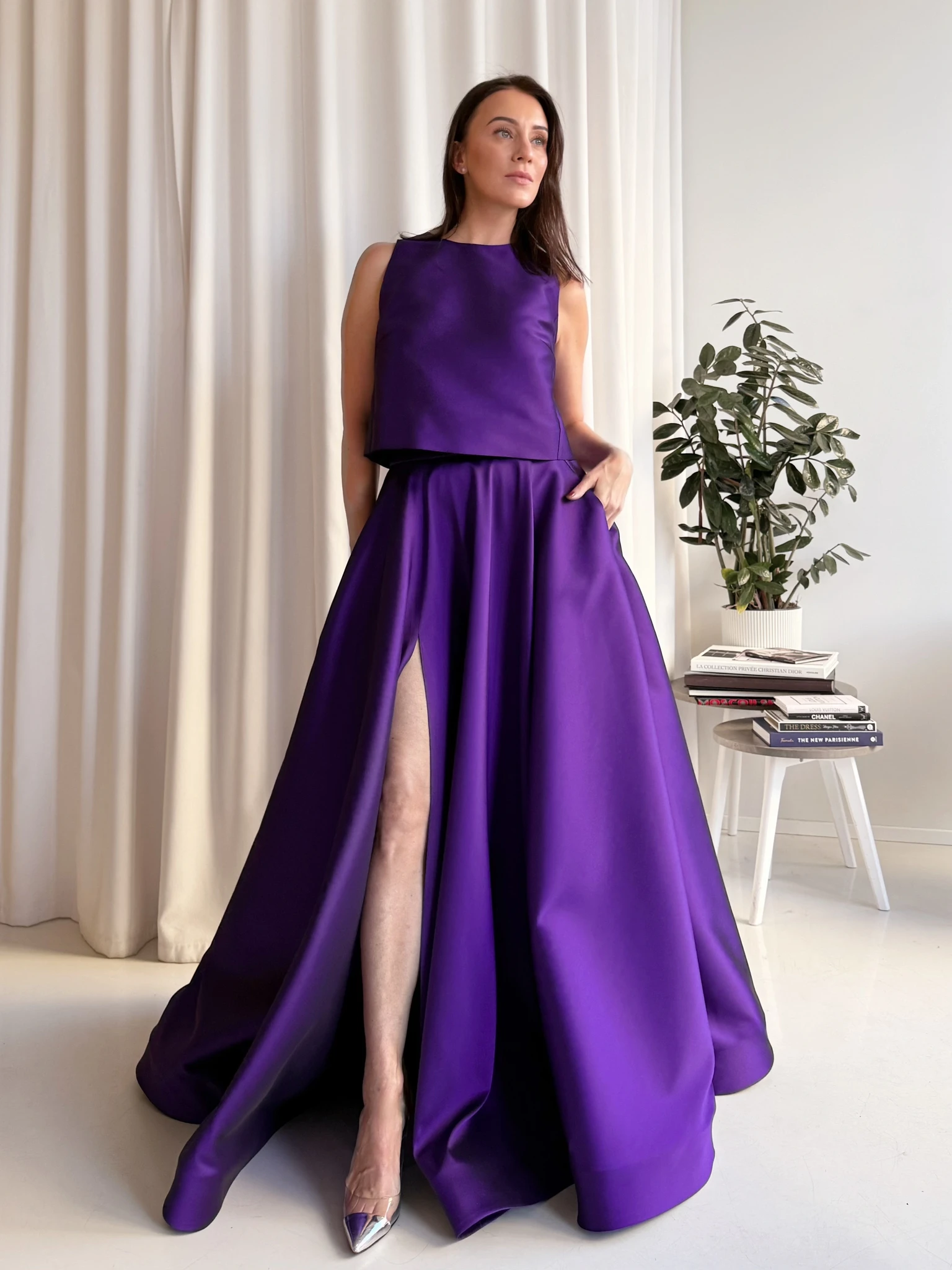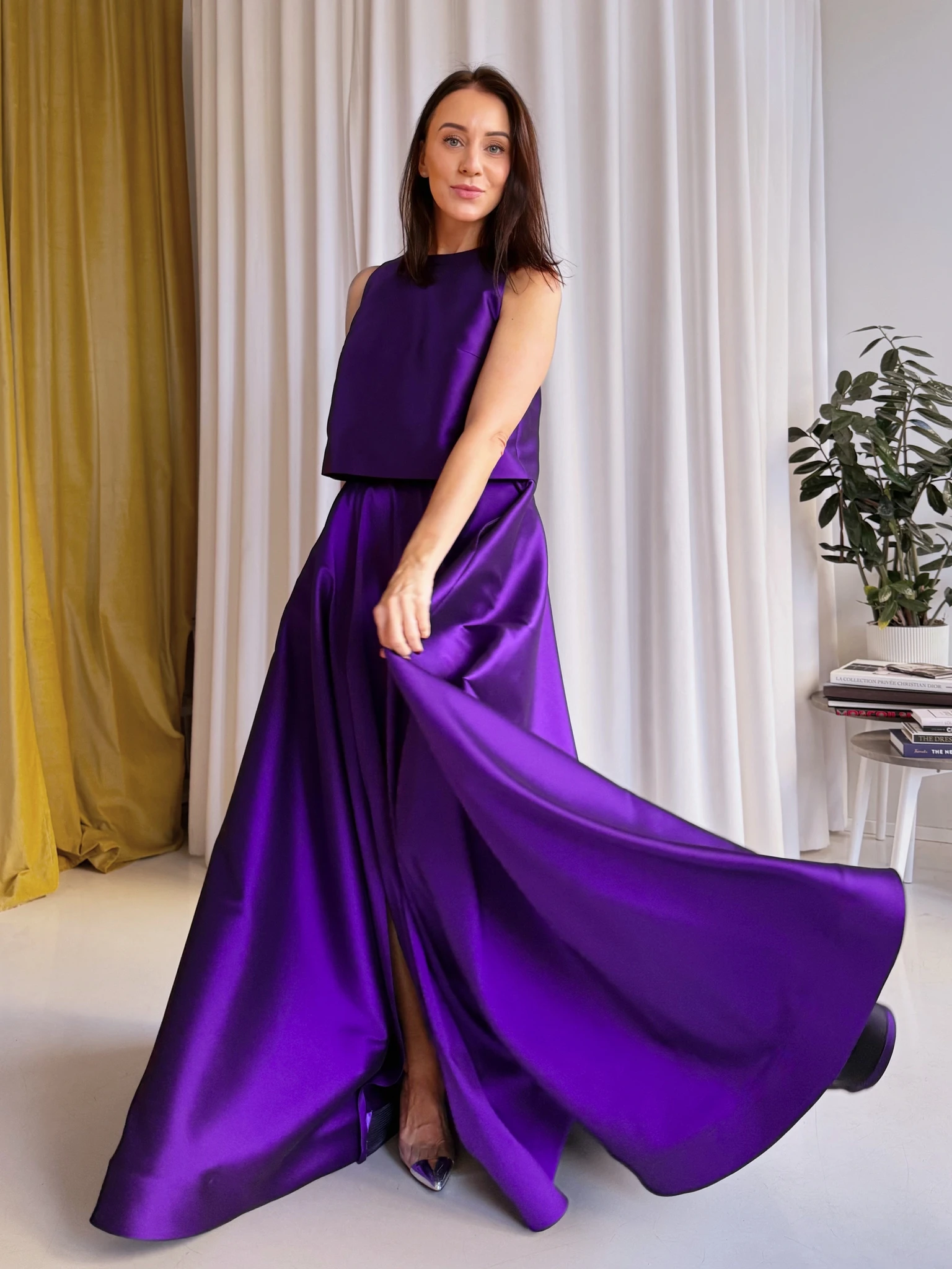Ülemine osa on minimalistliku lõikega crop-stiilis top. Maksiseelik avaldab muljet oma skulpturaalse volüümi ning pika lõhiku kaudu, mis lisab liikumisel dramaatilisust ja tänapäevast edge’i. Kvaliteetne satiinkangas loob luksusliku sära ja voolavuse.