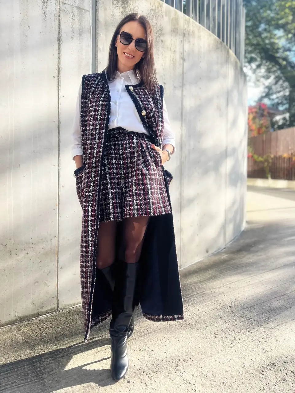 A longer, sleeveless tweed vest creates a layered and modern look while providing warmth and comfort on chilly fall days. Paired with high leg boots, this set is the perfect choice for daytime urban adventures as well as evening events where you want to look stylish and confident.