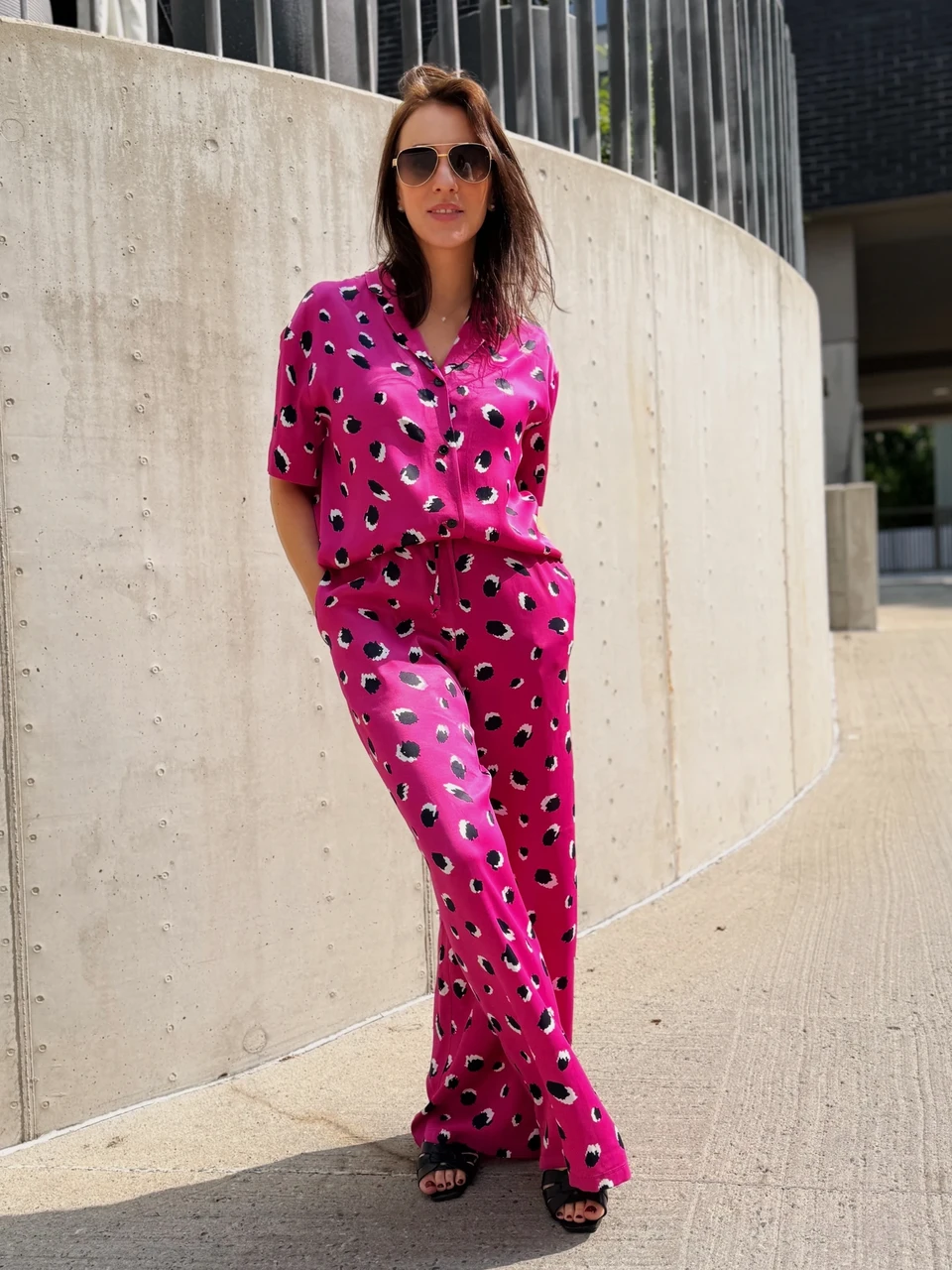 Too oma garderoobi särtsu pilkupüüdva kaheosalise komplektiga, mis on kaunistatud abstraktse musta-valge täpilise mustriga – justkui moodsalt tõlgendatud leopardiprint. Kerge ja voogav satiinkangas langeb elegantselt, pakkudes nii maksimaalset mugavust kui ka stiili.