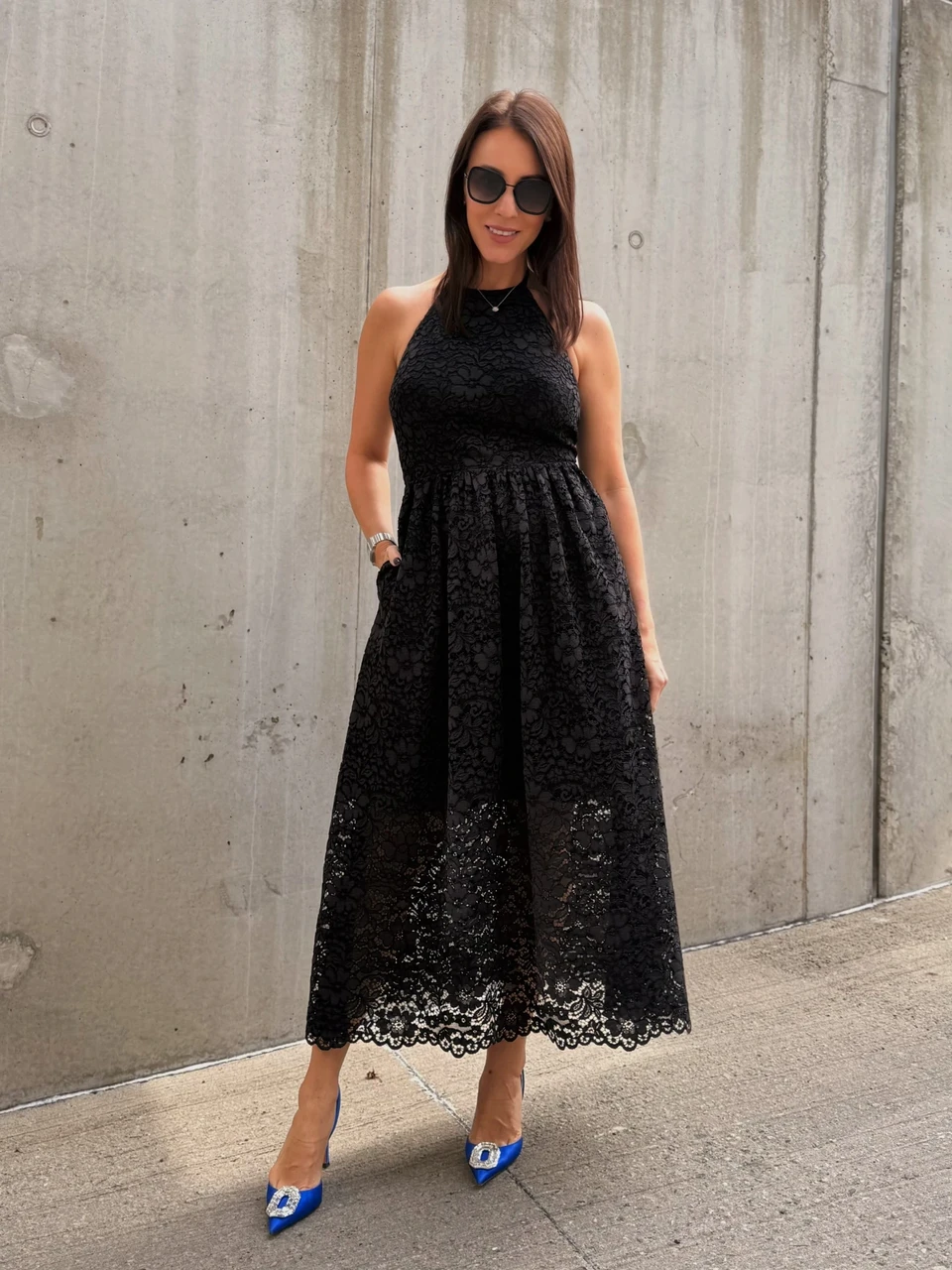 Elegantne ja naiselik must pitskleit, mis loob ajatult šiki silueti. Kleidi ülaosa on halter-lõikega, sidusega avatud selg lisab sensuaalset õhulisust. Seelikuosa on kergelt kellukeselõikeline ning kaunistatud kauni lillelise pitsiga, mis jätab alumises osas läbikumava efekti.