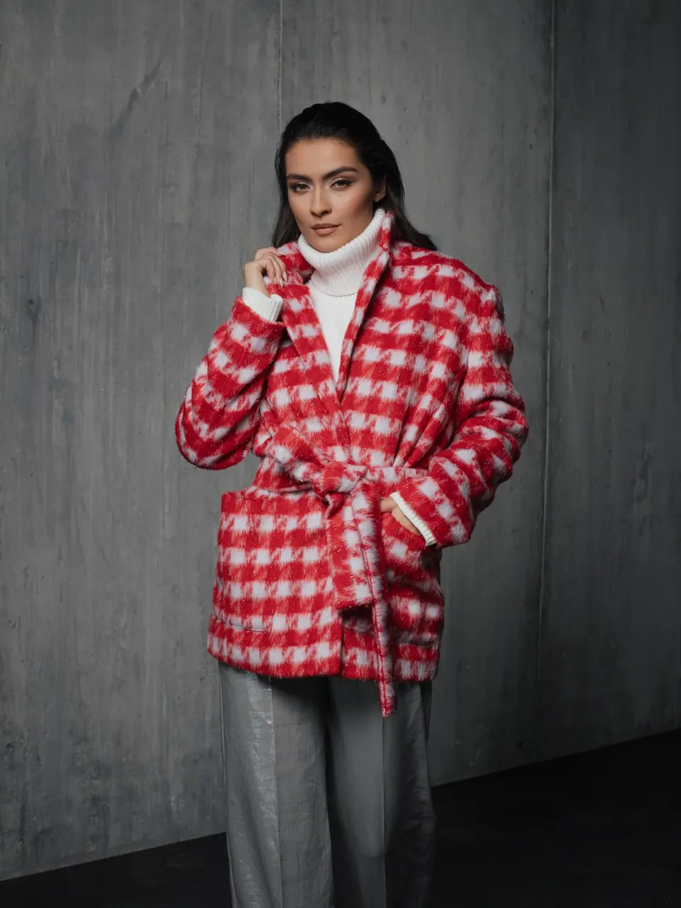 Stiilne punase-valge ruuduline villane jakk, millele lisab luksuslikku sära sissekootud hõbedane niit. Ideaalne jahedamateks päevadeks, pakkudes mugavust ja samal ajal silmapaistvat stiili. Täiuslik valik, kui otsid midagi erilist ja trendikat!