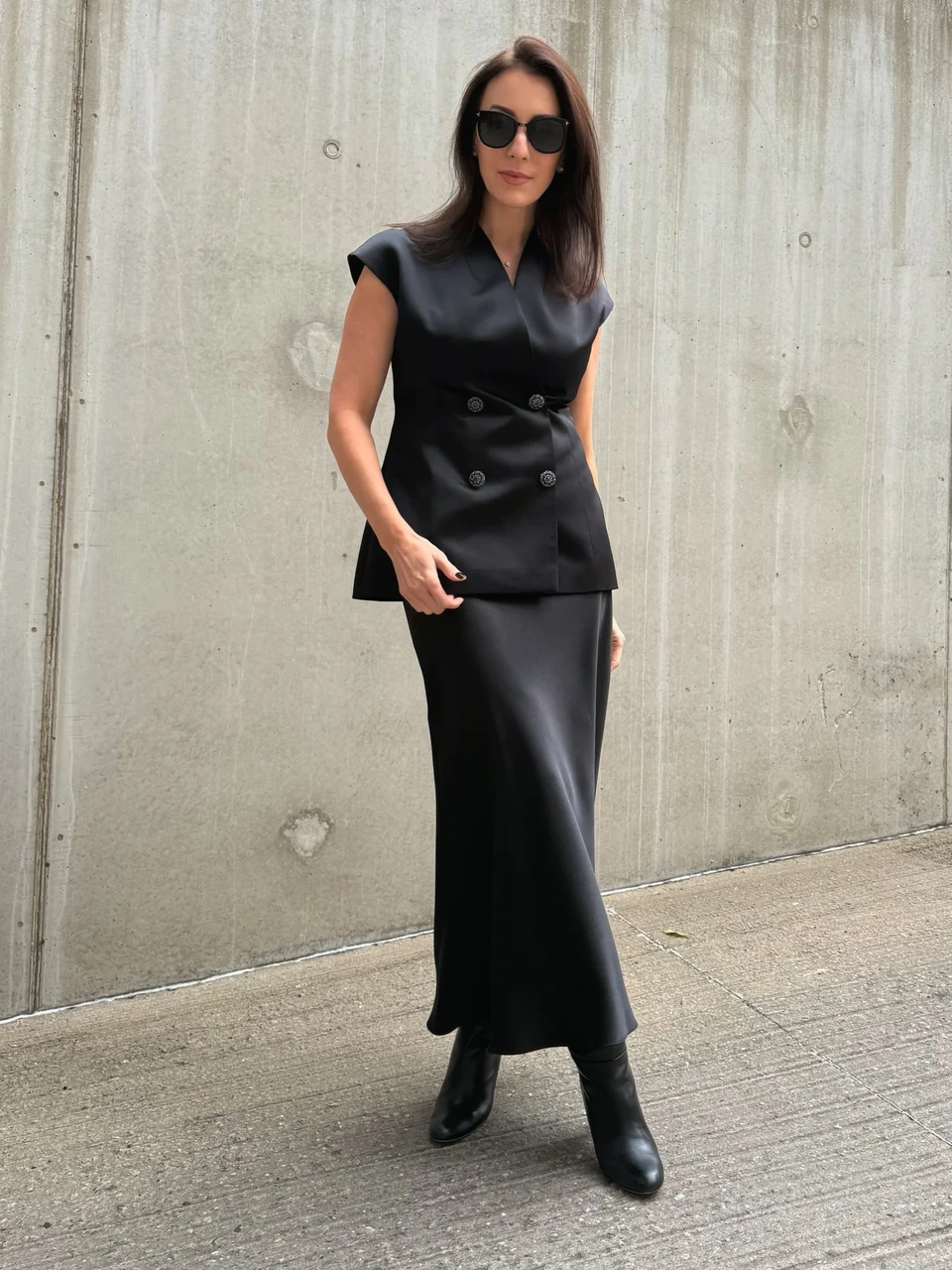Kergelt langev pikem midi-seelik täiendab komplekti, luues naiseliku ja voolava silueti. Sobib ideaalselt pidulikeks üritusteks või elegantseks igapäevaseks kandmiseks.