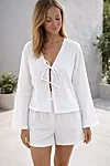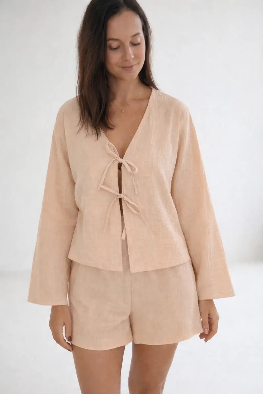 Kerge ja õhuline musliinkomplekt, mis ühendab mugavuse ja naiseliku minimalismi. Pehmest kahekordsest musliinkangast pluus on eest seotud õrnade paeltega, luues loomuliku ja kergelt mängulise silueti. Sügav V-kaelus ja pikad sirge joonega varrukad lisavad tasakaalu ning elegantsi.